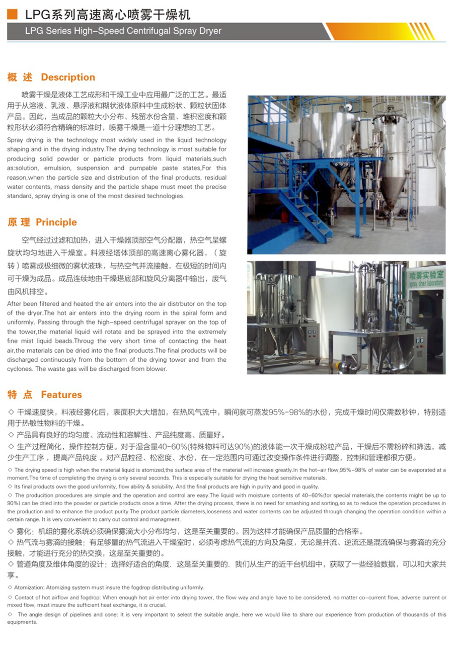 LPG系列離心式噴霧干燥機系氣液兩相并流式干燥設備,采用高速離心式霧化器,將料液霧化成微細的霧滴,與經分布器分布后的熱空氣在干燥塔內混合,迅速進行熱質交換,在極短的時間內干燥成為粉狀產品。生產控制和產品質量控制方便可靠,廣泛應用于不同種類液體物料的干燥生產。