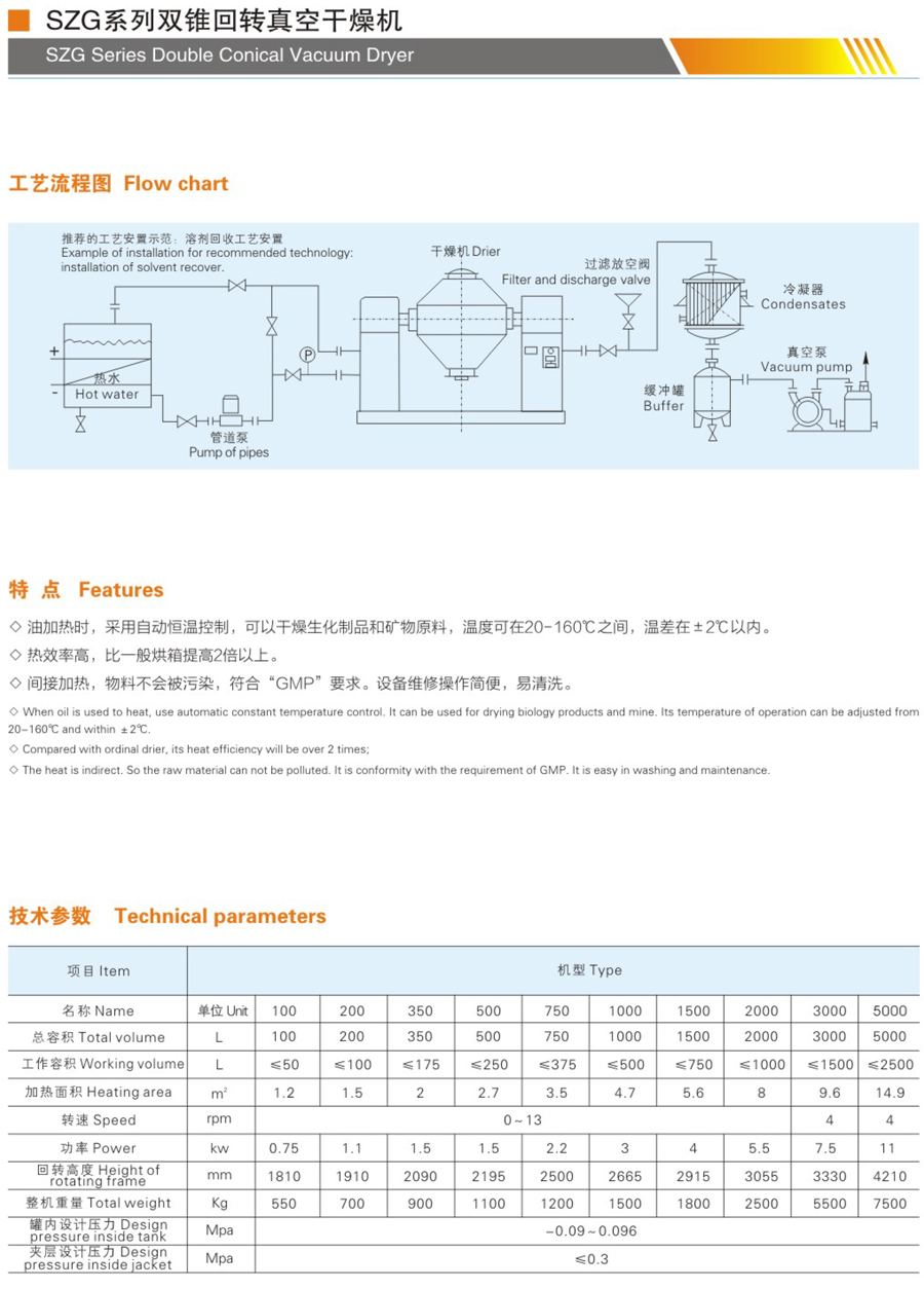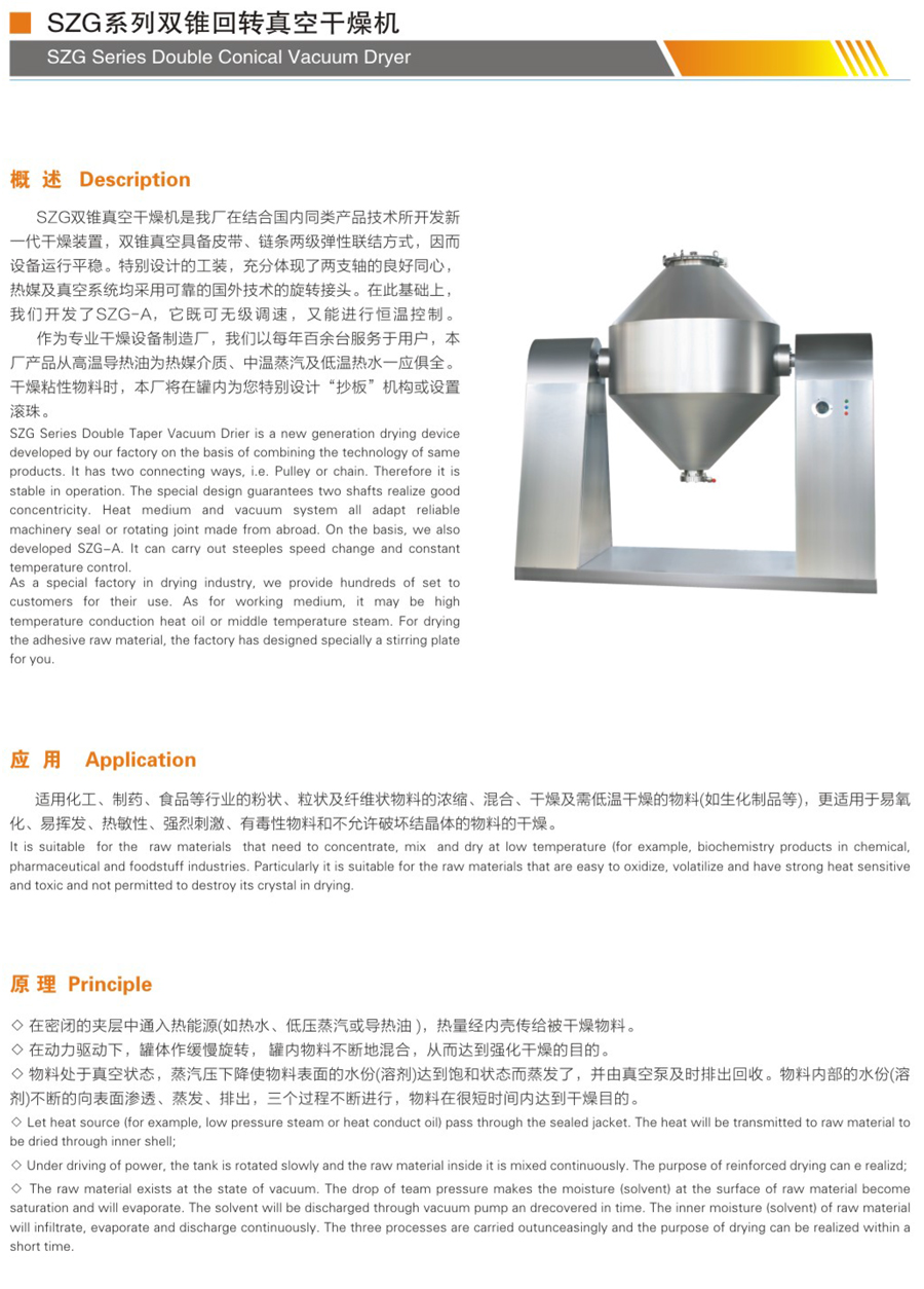 在密閉的夾層中通入熱能源(熱水、低壓蒸汽或?qū)嵊?,熱量經(jīng)內(nèi)殼傳給被干燥物料。在動(dòng)力驅(qū)動(dòng)下,罐體作緩慢旋轉(zhuǎn),罐內(nèi)物料不斷地翻動(dòng)、混合,從器壁內(nèi)表面接受熱量,從而達(dá)到強(qiáng)化干燥的目的。物料處于真空狀態(tài),蒸汽壓下降使物料表面的水份(溶劑)達(dá)到飽和狀態(tài)而蒸發(fā)了,并由真空泵及時(shí)排出回收。物料內(nèi)部的水分(溶劑)不斷地向表面滲透、蒸發(fā)、排出,三個(gè)過程不斷進(jìn)行,物料在短時(shí)間內(nèi)達(dá)到干燥目的。