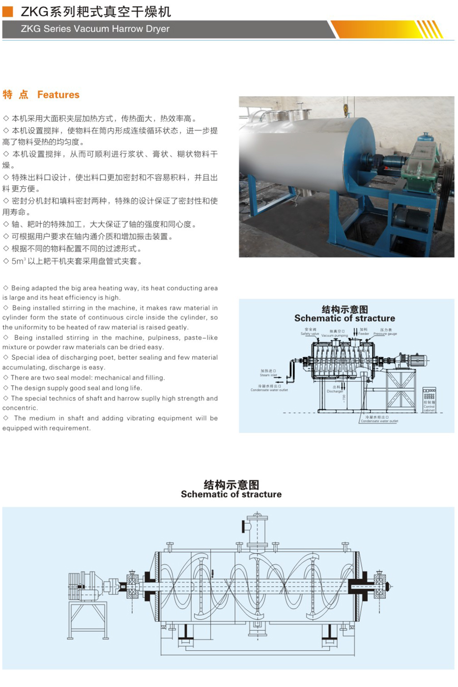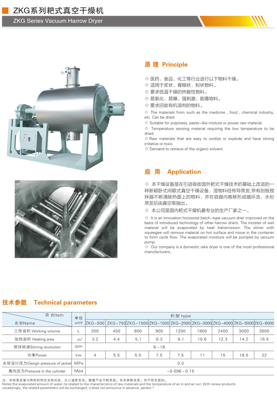 真空耙式干燥具有結構簡單,操作方便,使用周期長,性能穩定可靠,蒸汽耗量小,適用性能強,產品質量好,特別適用于不耐高溫、易燃、調溫下易氧化的膏狀物料的干燥,該機經用戶長期使用證明是一良好的干燥設備。
